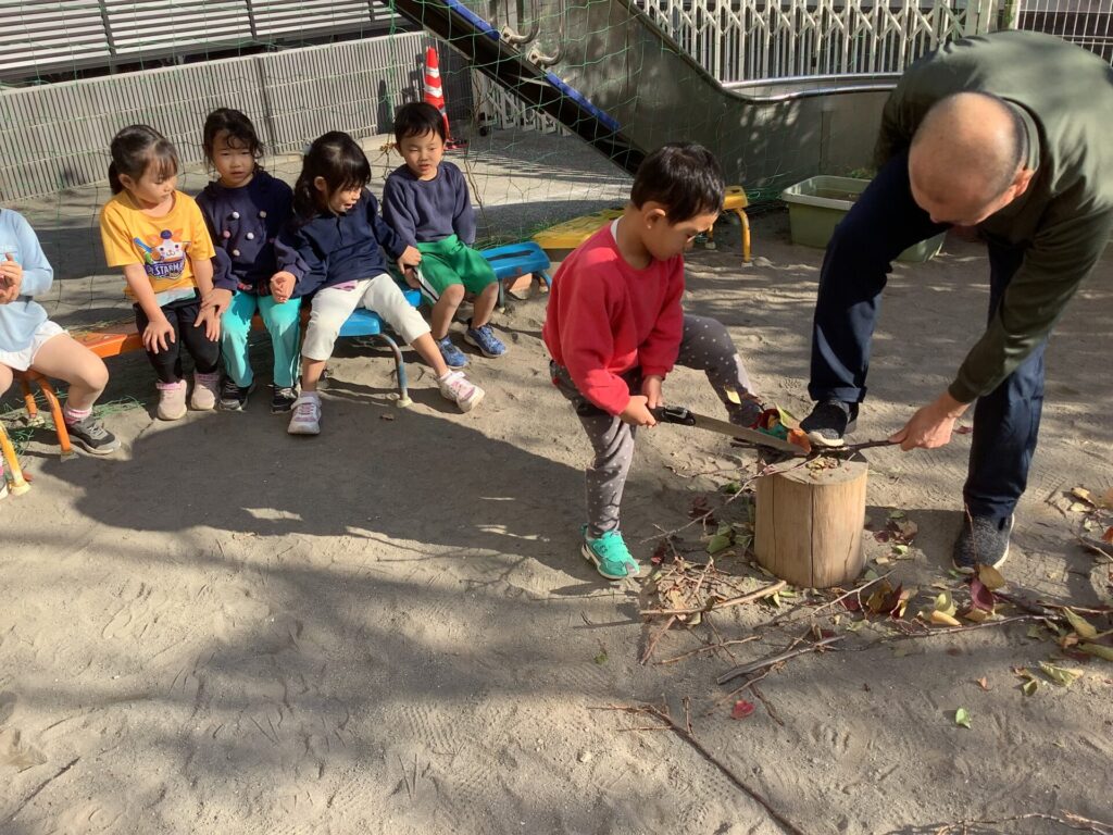 自分たちで焚き火に必要な木材を切ったり、落ち葉を集めて火起こしの準備をしました。