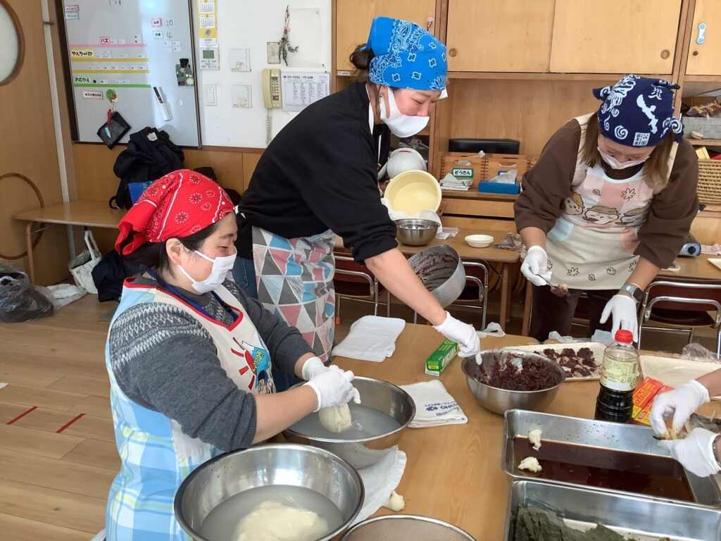 のり醤油、きなこ、あんこ、納豆味など、いろいろな味を楽しみながら、みんなの健康を祈って美味しくいただきました。