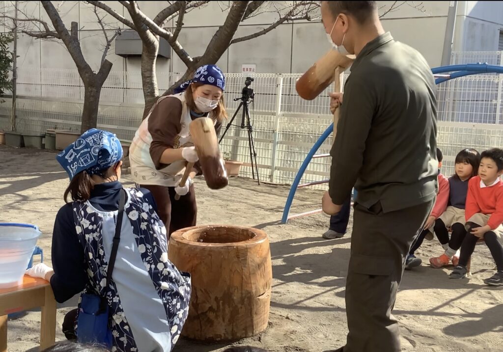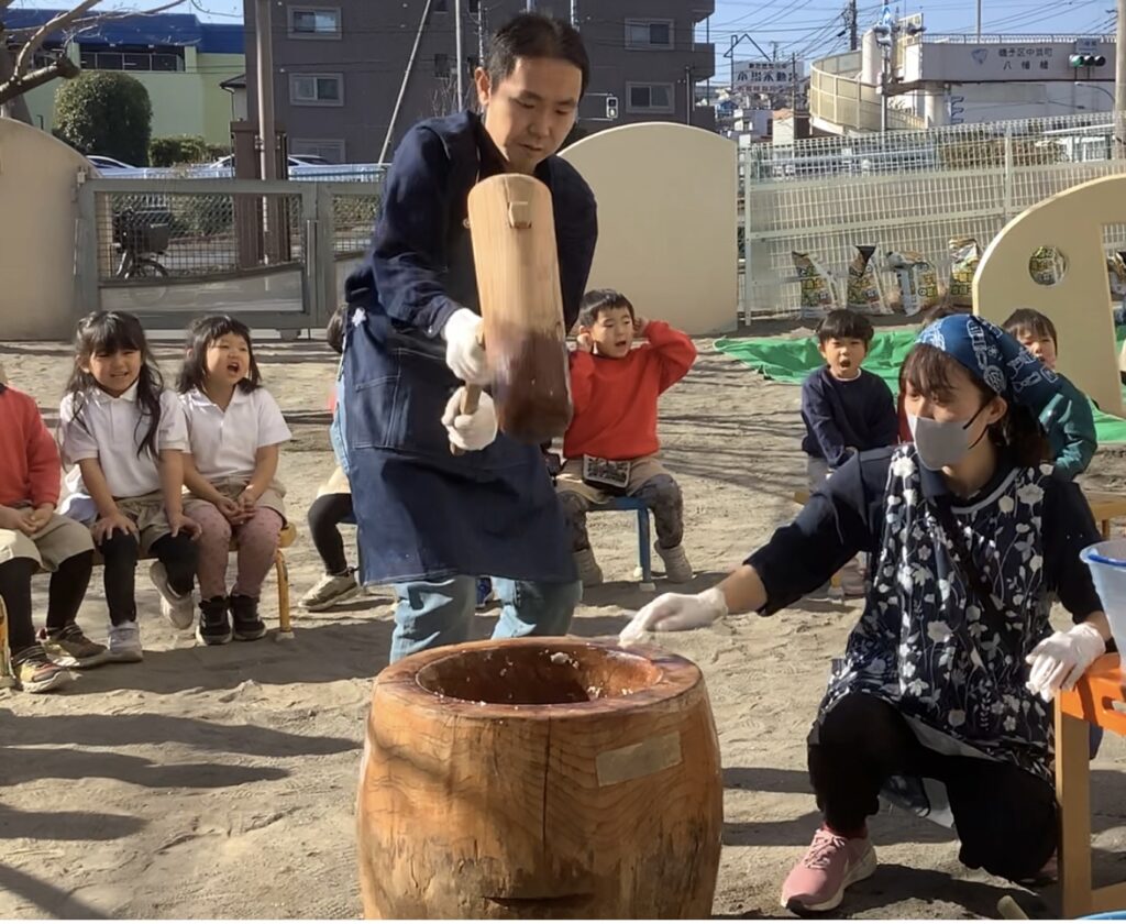 年長児は一人で杵を持ち、もちをつきました!「よいしょ!」「がんばれ!」元気な子どもたちの声が園庭に響きわたりました!